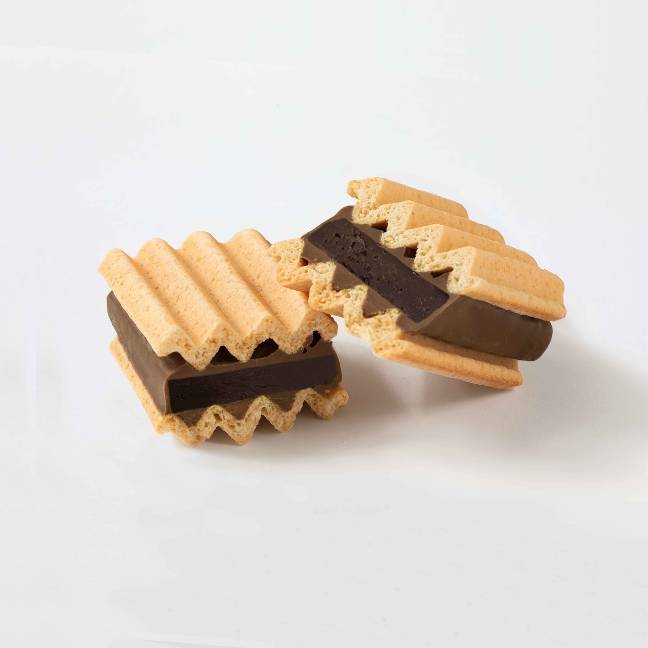 ビターチョコレートにプラリネアーモンドを混ぜたガナッシュをほろっとくちどけなめらかなヴァッフェルクッキーで挟んだチョコサンドクッキーです。ほろ苦いビターチョコレートに少し甘さ控えめなヴァッフェルクッキーを合わせることで、上品な大人な味わいを演出してくれます。